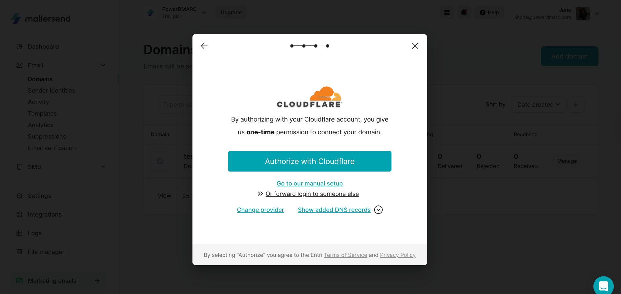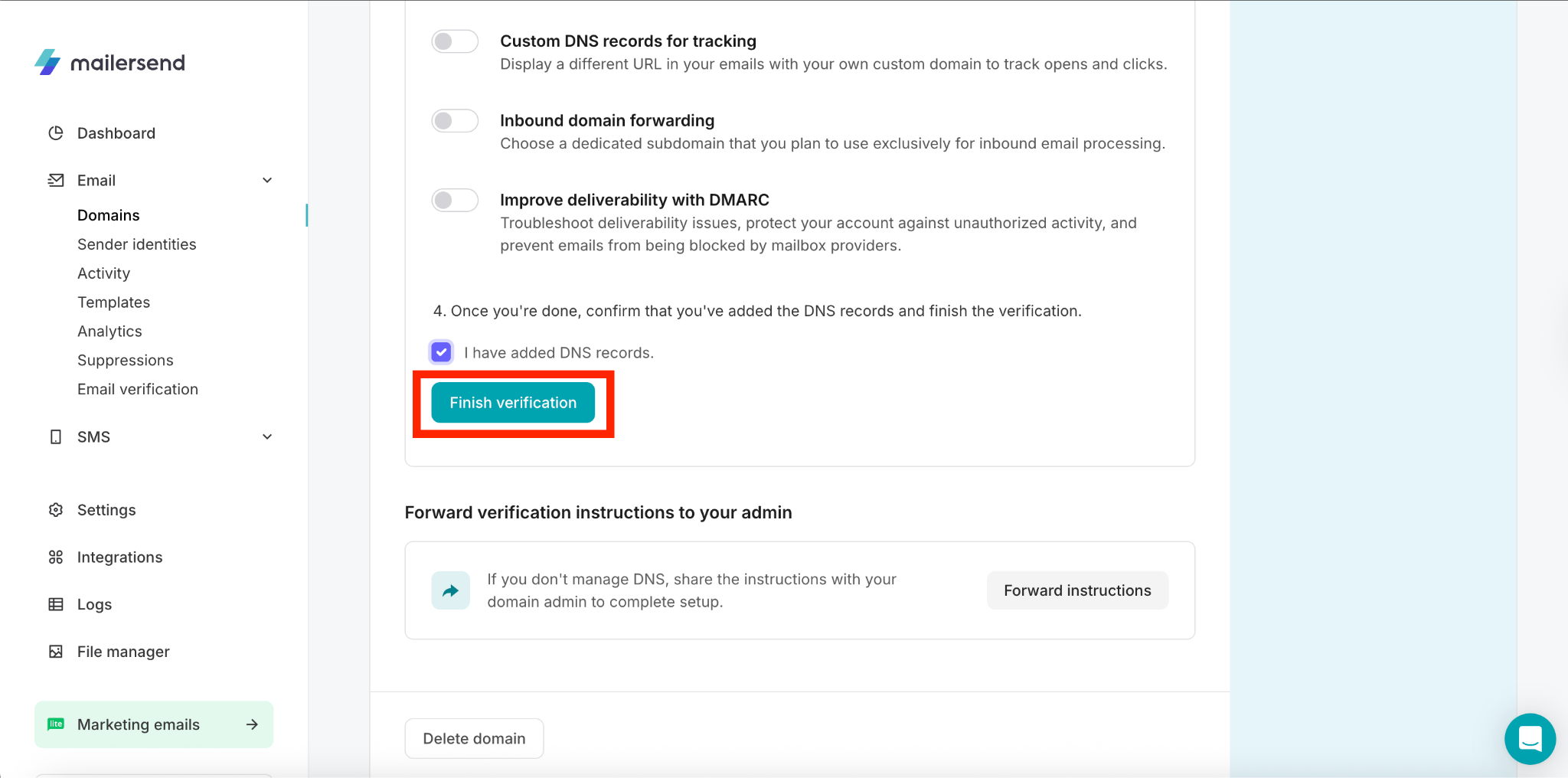 Zodra je DNS wijzigingen zijn doorgevoerd, ga je terug naar je MailerSend dashboard, vink je het vakje "Ik heb DNS records toegevoegd" aan en klik je op "Verificatie voltooien".
