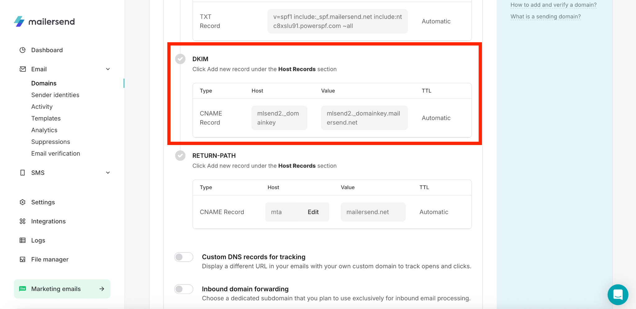 MailerSend zal je DKIM record weergeven. Kopieer dit record en plak het in je DNS-beheerconsole.