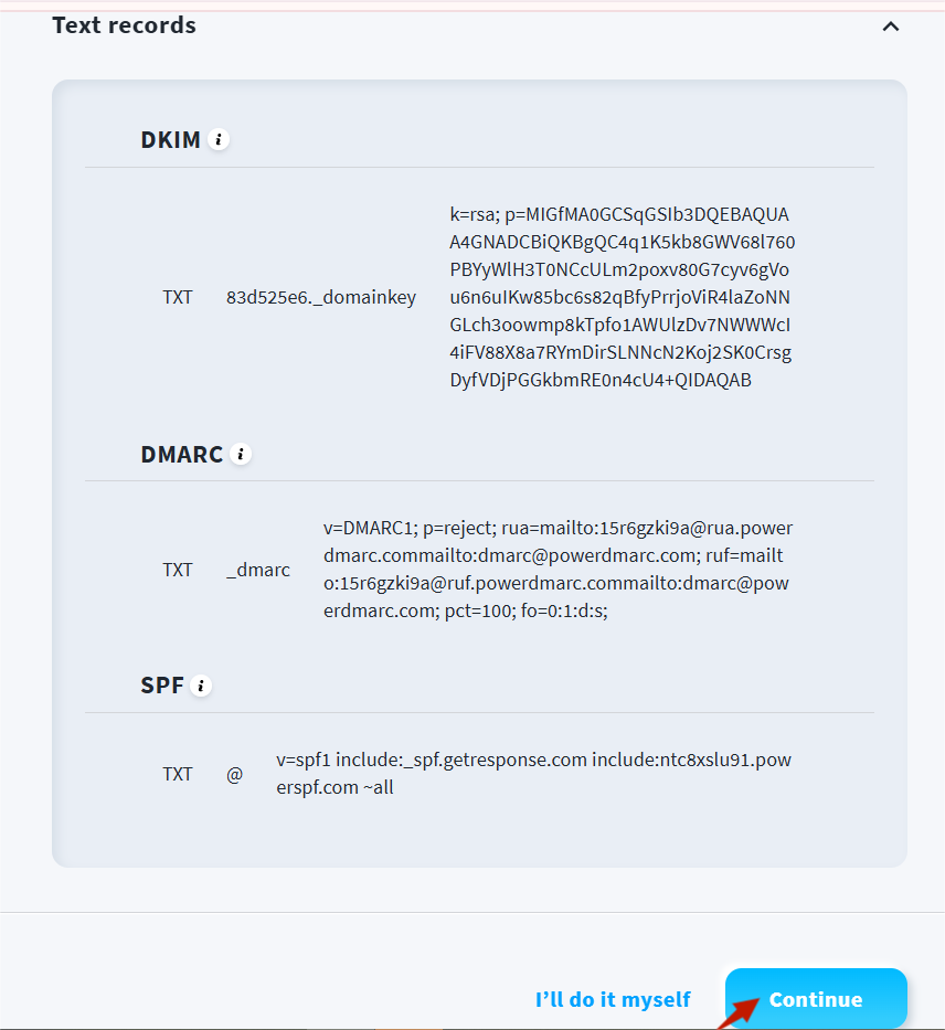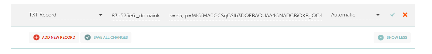 2) GetResponse geeft je een DKIM record als een TXT record. Het begint met "k=rsa". Je moet de DKIM identifier en DKIM key kopiëren en in je DNS plakken.