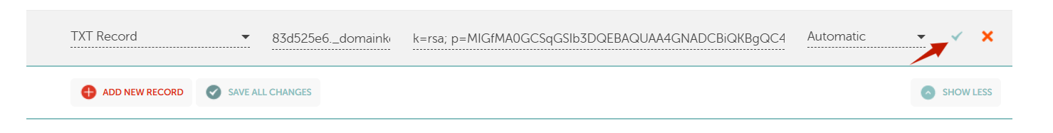 7) Sla de TXT-record die je net hebt gemaakt. U moet dan wachten tot de DNS-wijzigingen zijn doorgevoerden dat kan tot 48 uur duren. Zodra de propagatie is voltooid, zal GetResponse automatisch de DKIM record detecteren en de authenticatie van uw domein bevestigen.