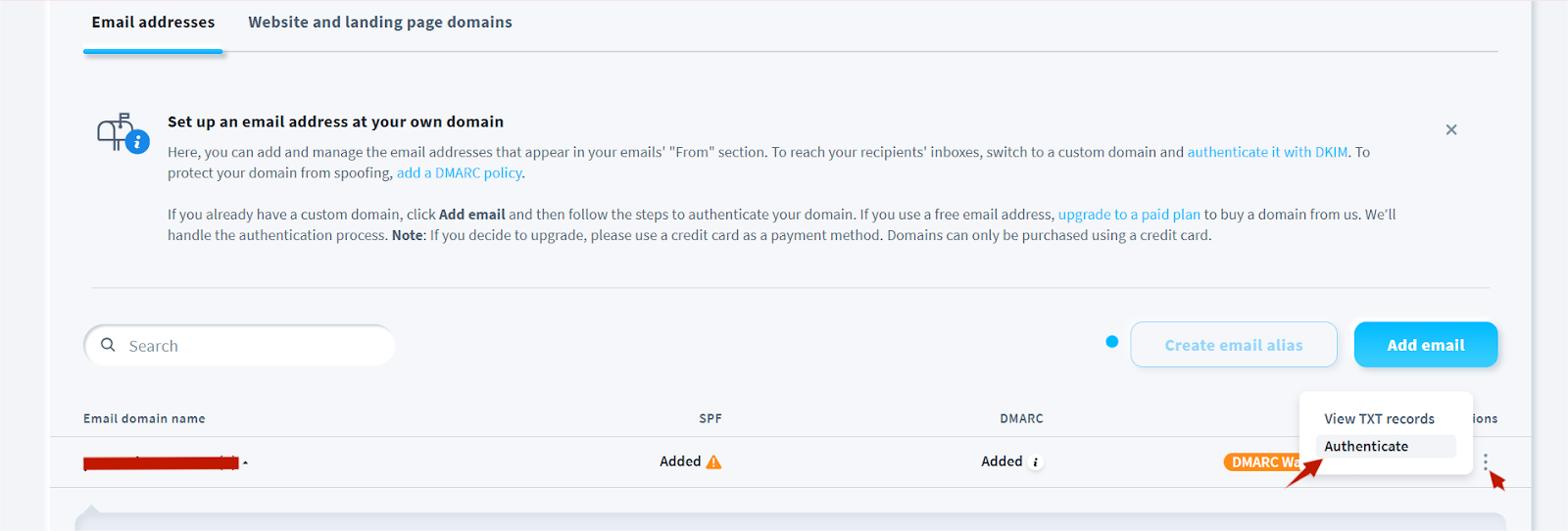 1) Nadat je je e-mailadres hebt geverifieerd, selecteer je het domein dat je wilt verifiëren en klik je op verifiëren.