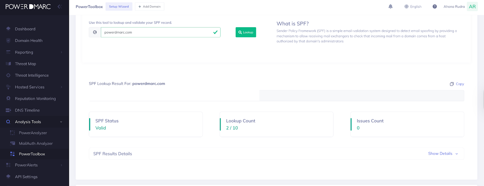 Ga naar analysegereedschappen > PowerToolbox > Opzoekgereedschappen > SPF record opzoeken