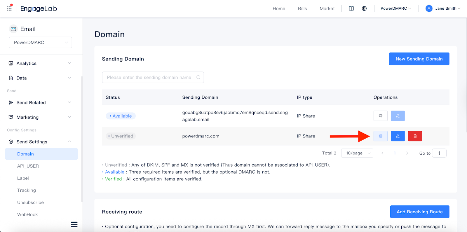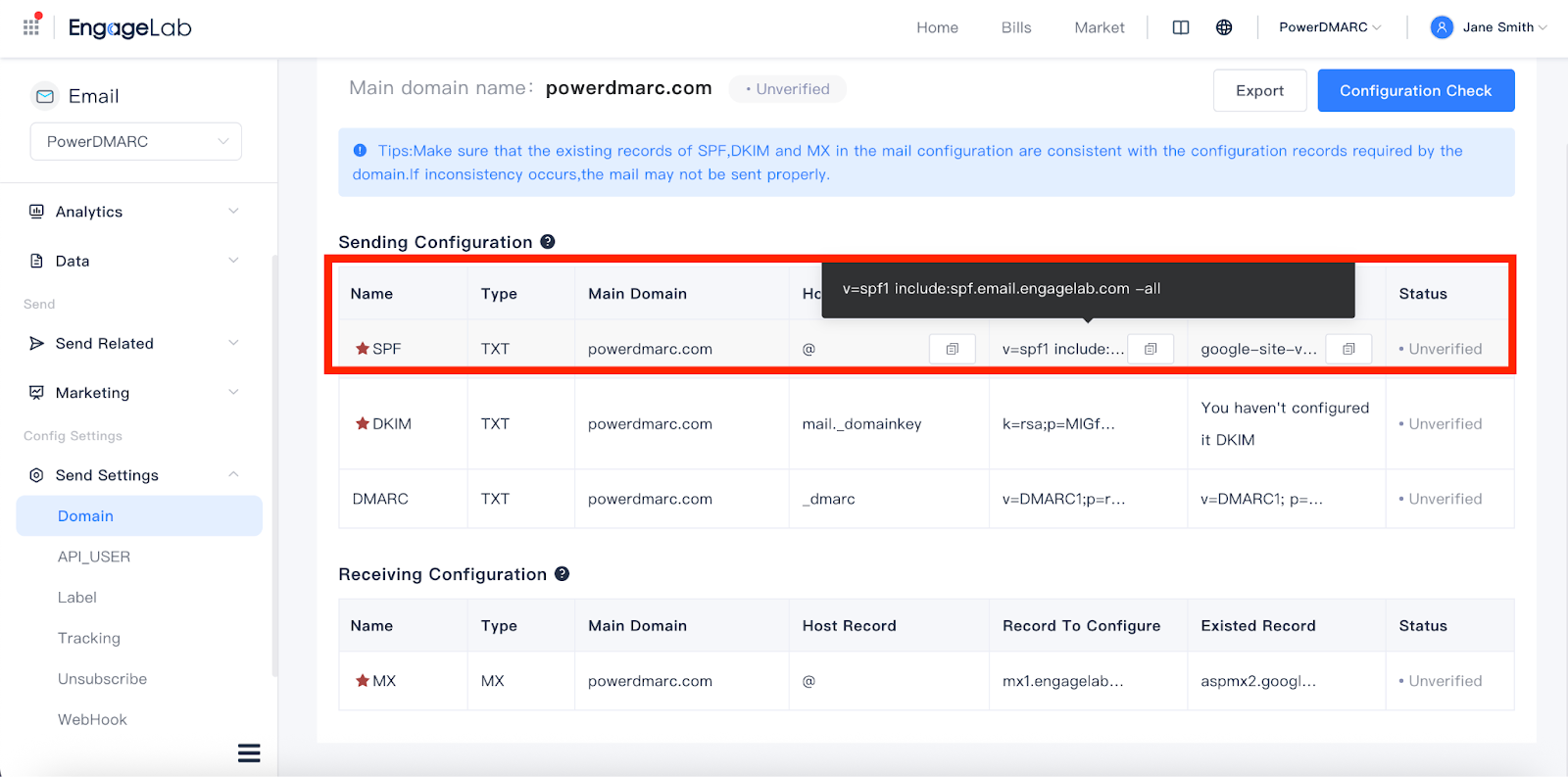 Zodra u uw SPF-record hebt opgeslagen en de DNS de wijzigingen heeft laten propageren, gaat u terug naar uw EngageLab-portaal en klikt u op "Configuratiecontrole".